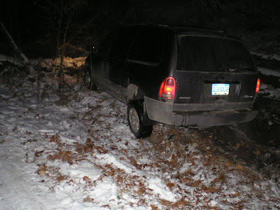 As we left 322 to take a "short cut" we rounded a bend in the road and watched Mark's van go over the bank and into the woods. I am sure I hollered slow down loud enough for Mark to hear it in the van ahead of us and our walk talkies were of no use. To make a long story short Wayne dodged a big tree and Mark's van and settled down off the road into the woods as well. After waiting for AAA we decided to get them out ourself. I am not sure how we were able to get them out. Wayne had studded snow tires on and he came out fairly easy with some pushing. Mark's van was down in a little more and had many obstacles to over come. It was sitting high sided with the right tire off the ground. With some pieces of wood we were able to get wedged under the tire it was able to move backwards. We got it jockeyed around and was able to push pull and with Kenton and I hanging off the right front fender for added weight for tractions we were able to get the van up out of the woods.